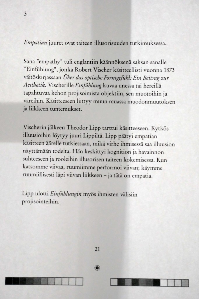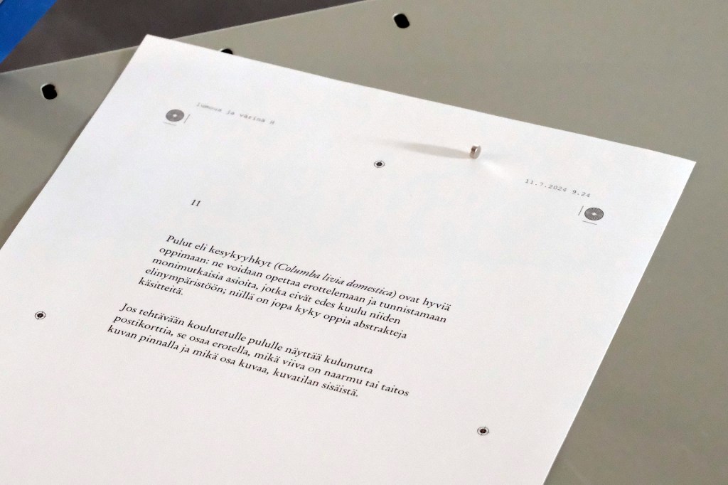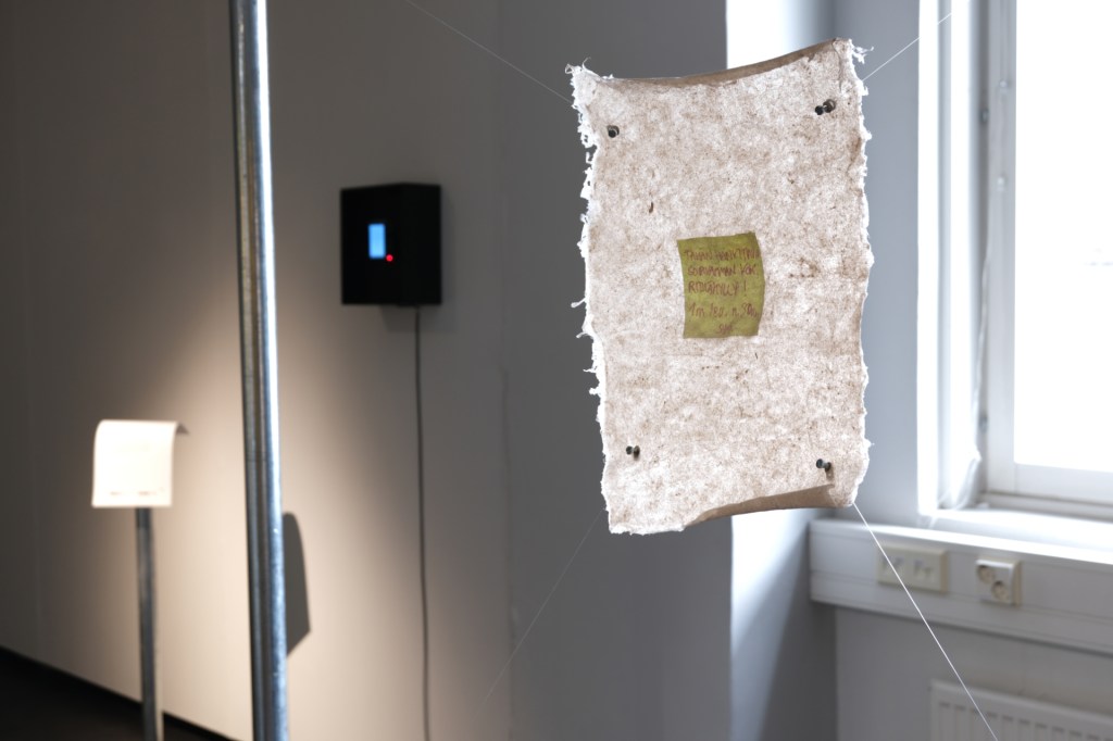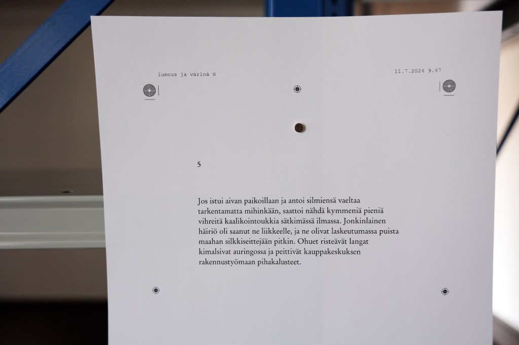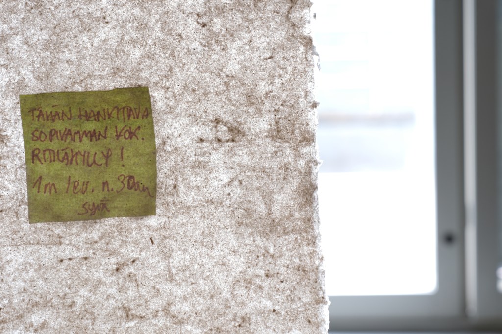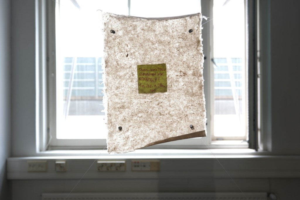 (1) Merkityksellisiksi kasvavat materiaalit ja toiset, jotka jäävät katseen paitsioon. Paperi ja sen materiaalisuudet. Paperinjälkeinen aika. Näyttely on innoittunut taiteen historiasta, vanhasta teknologiasta ja mekaniikasta kuin myös toimistomaisesta näyttelytilasta, teollisuuden ympäristöistä, kauppakeskuksista ja rakennustyömaista osana kaupunkien historiaa ja elämää. Näyttely on innoittunut nostalgian kaupallisten ja naiivien muotojen kritiikistä.