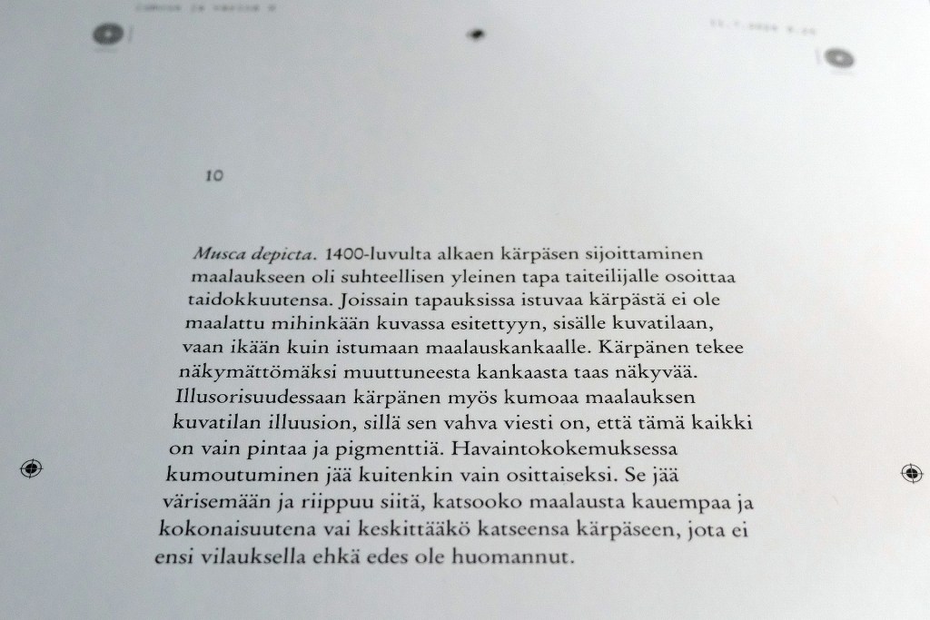 Musca, depicta -näyttely on osa Pathiranen havaintoa ja havainnon häiriöitä käsittelevää kirjojen ja näyttelyiden kokonaisuutta. Esillä on muun muassa piirtoheitin, metalliputkia ja varastohyllyjä, käsintehtyä paperia, tekstiä, kirjoituskonetaidetta ja valokuva yhdestä luonnoksesta.