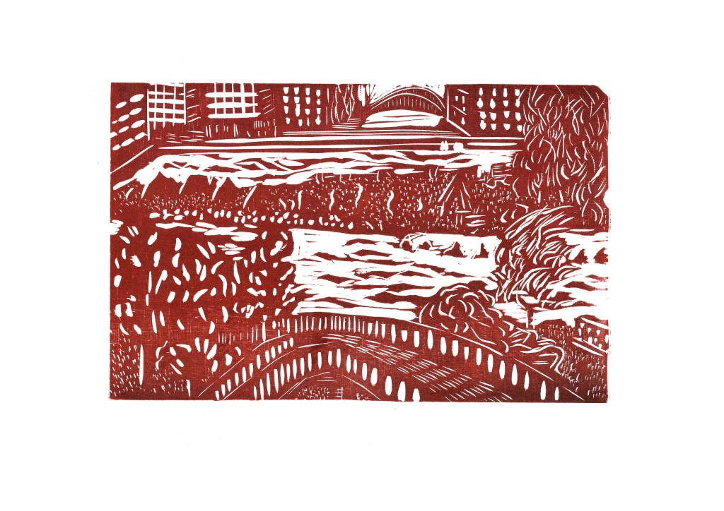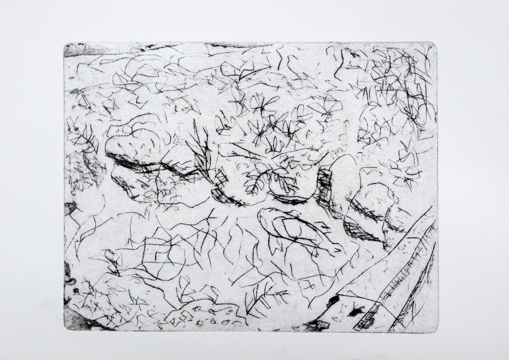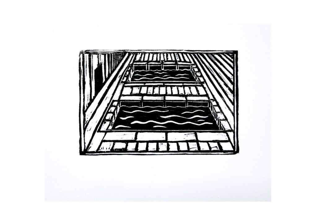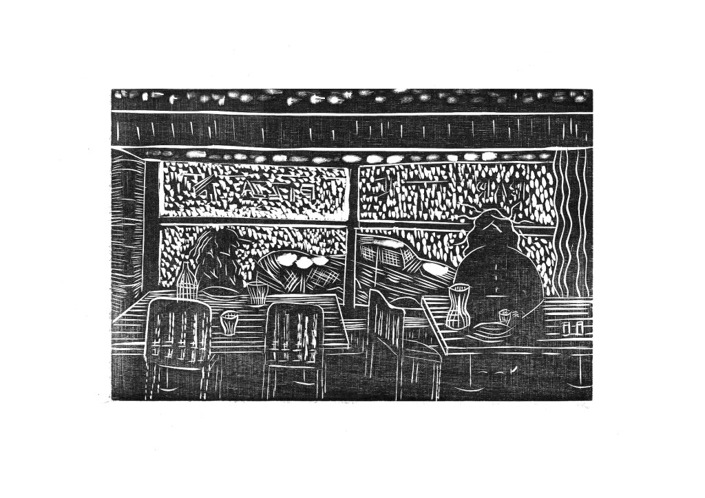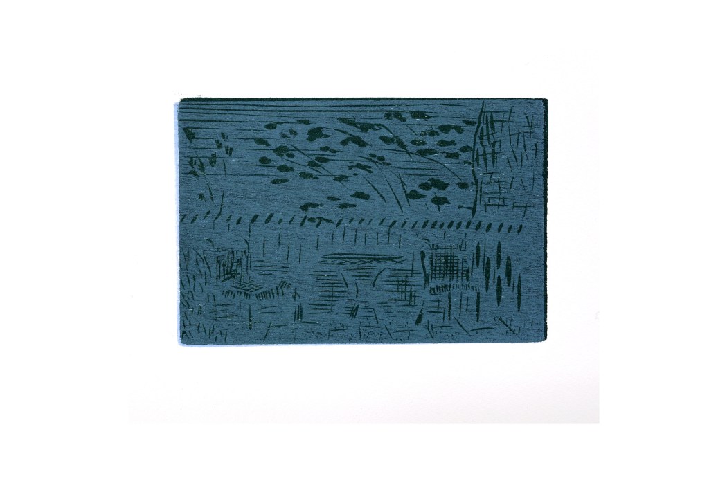 Sarjasta Muistin paikat, 2025, puupiirros, 10 x 13 cm