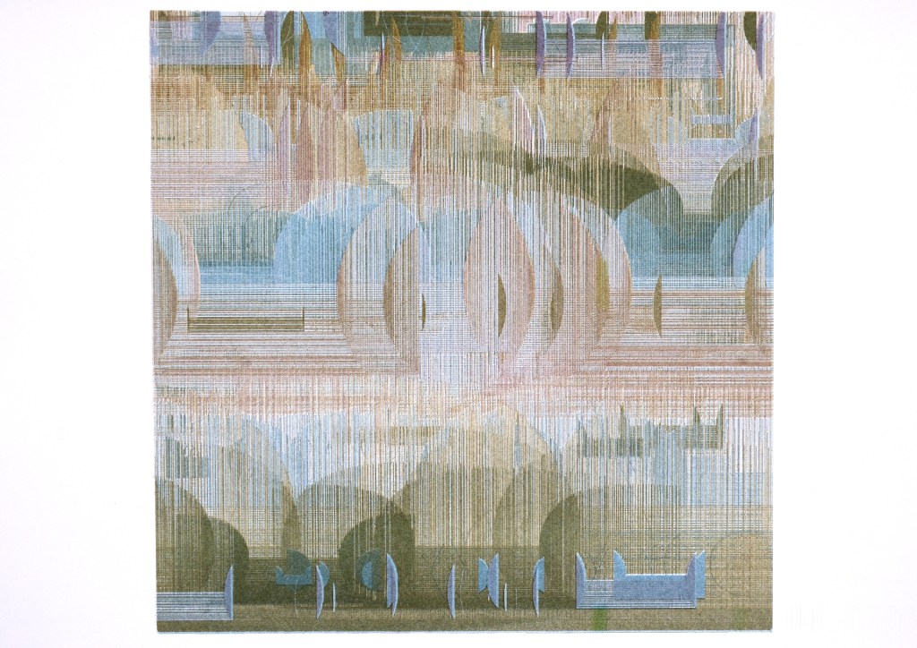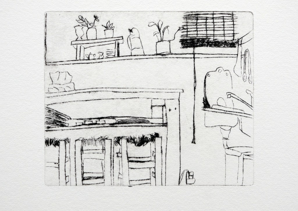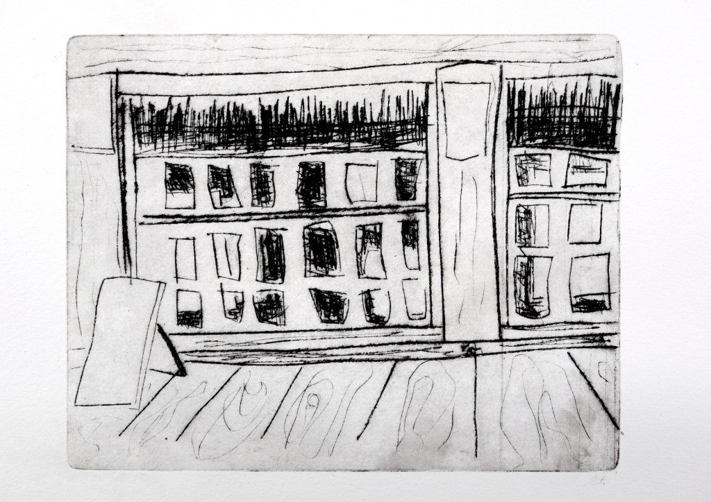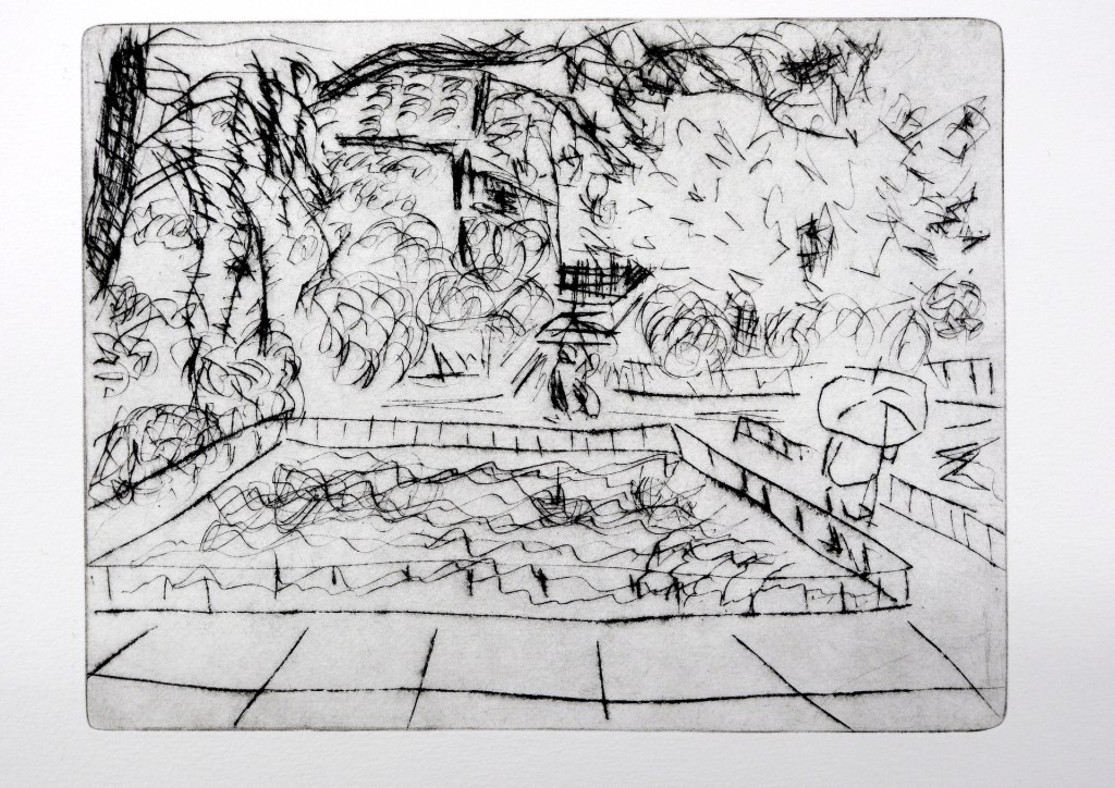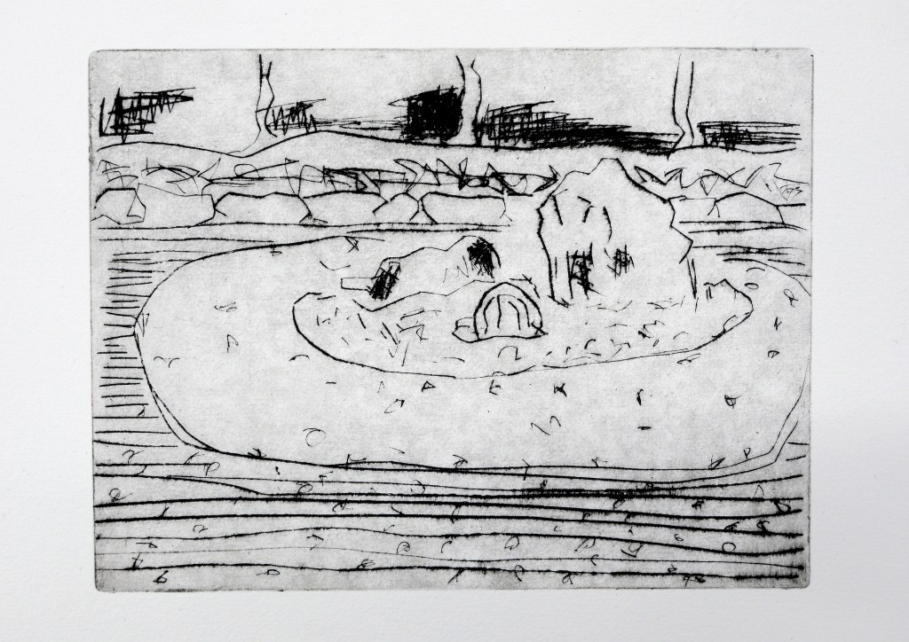 Sarjasta Muistin paikat, 2025, puupiirros, 10 x 13 cm