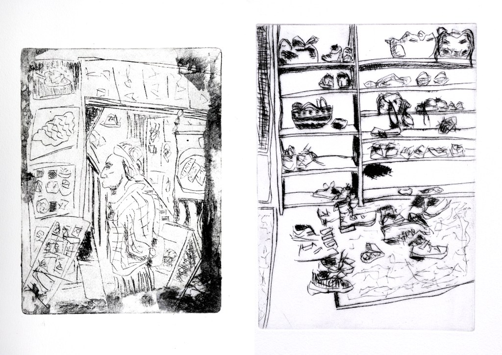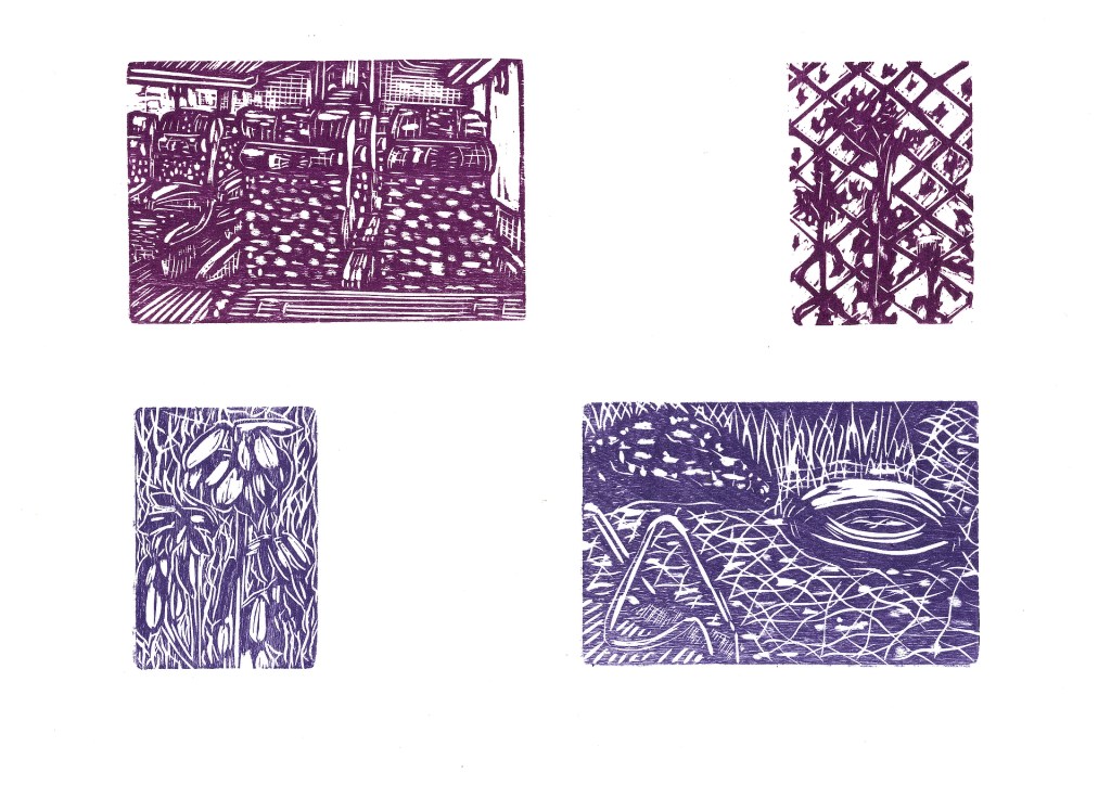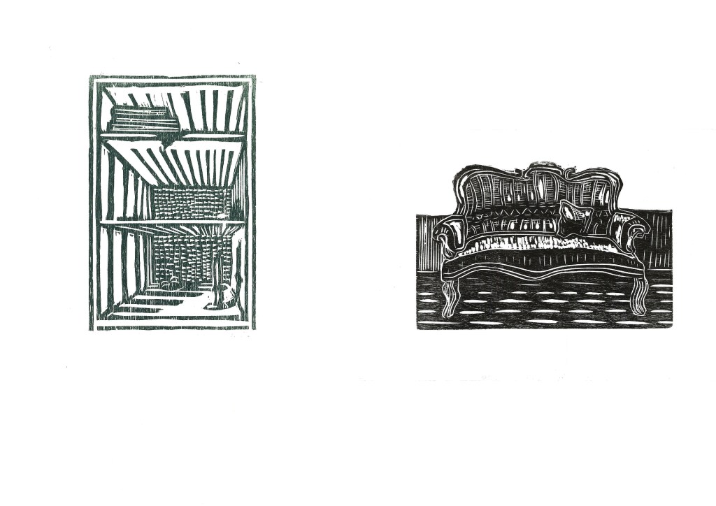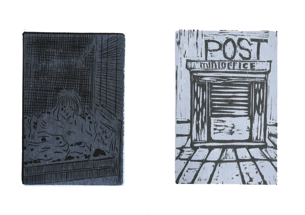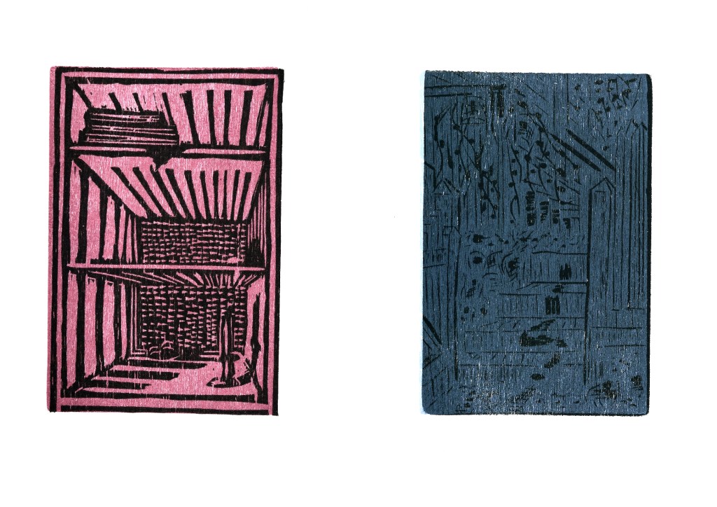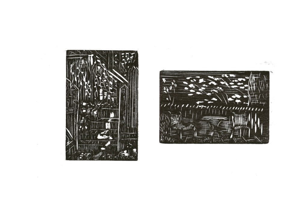 Sarjasta Muistin paikat, 2025, puupiirros, 10 x 13 cm ja 6,5 x 10 cm
