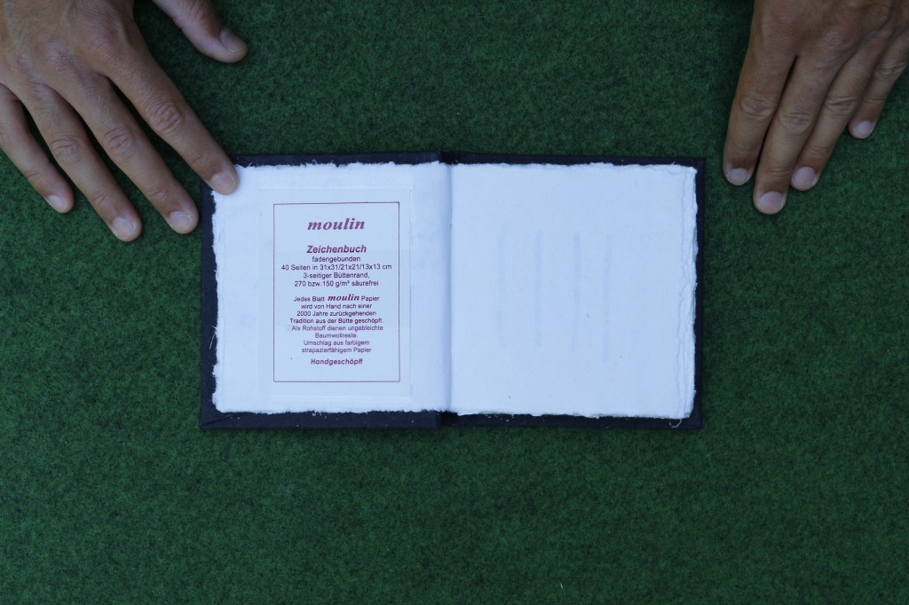 moulin. Zeichenbuch. fadengebunden. 40 Seiten in 31×31/21×21/13×13 cm. 3-seitiger Büttenrand, 270 bzw. 150 g/m2 säurefrei. Jedes Blatt moulin Papier wird von Hand nach einer 200 Jahre zurückgehenden Tradition aus der Bütte geschöpft. Als Rohstoff dienen ungebleichte Baumwollreste. Umschlag aus farbigem strapazierfähigem Papier. Handgeschöpft.
