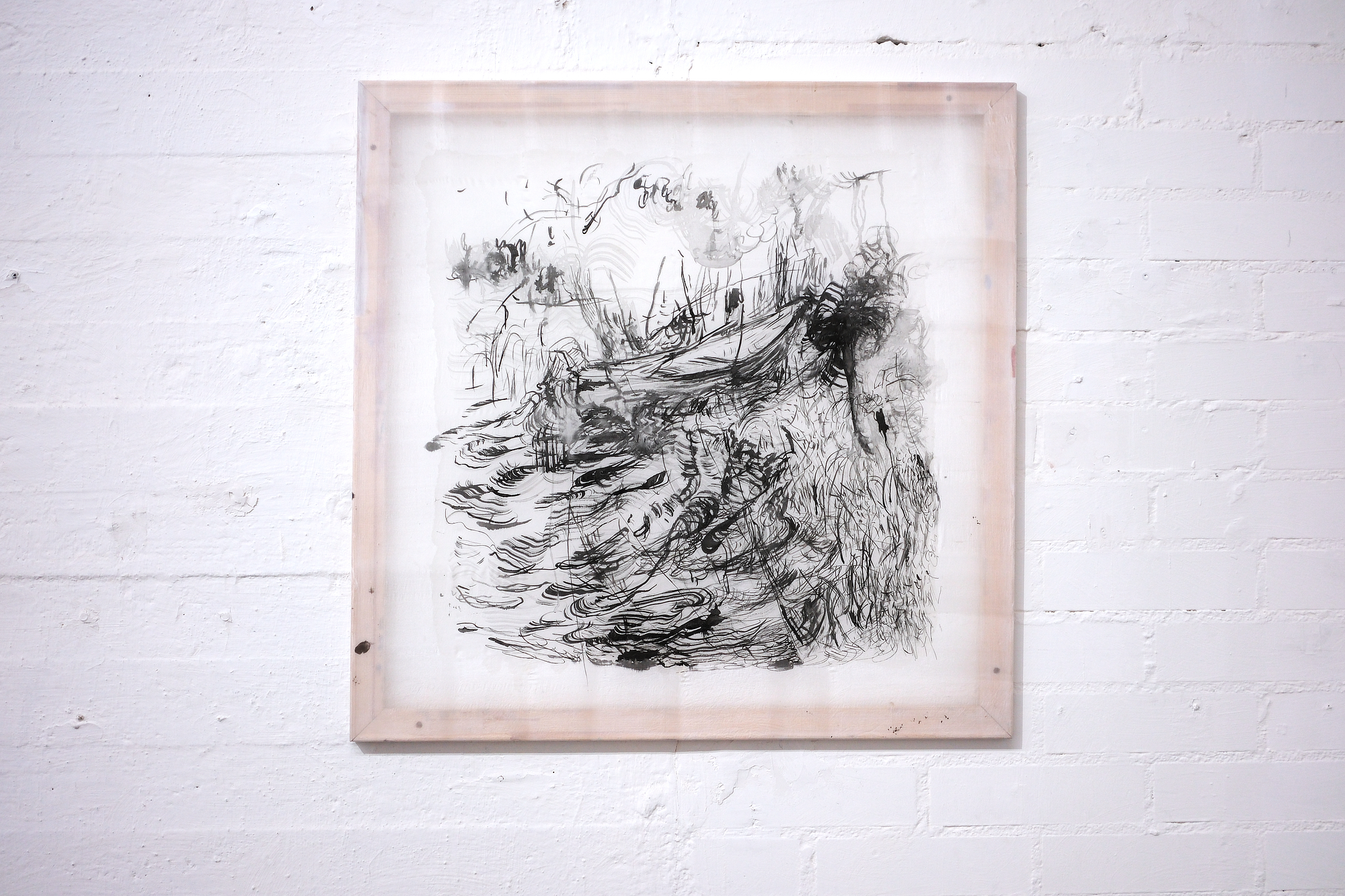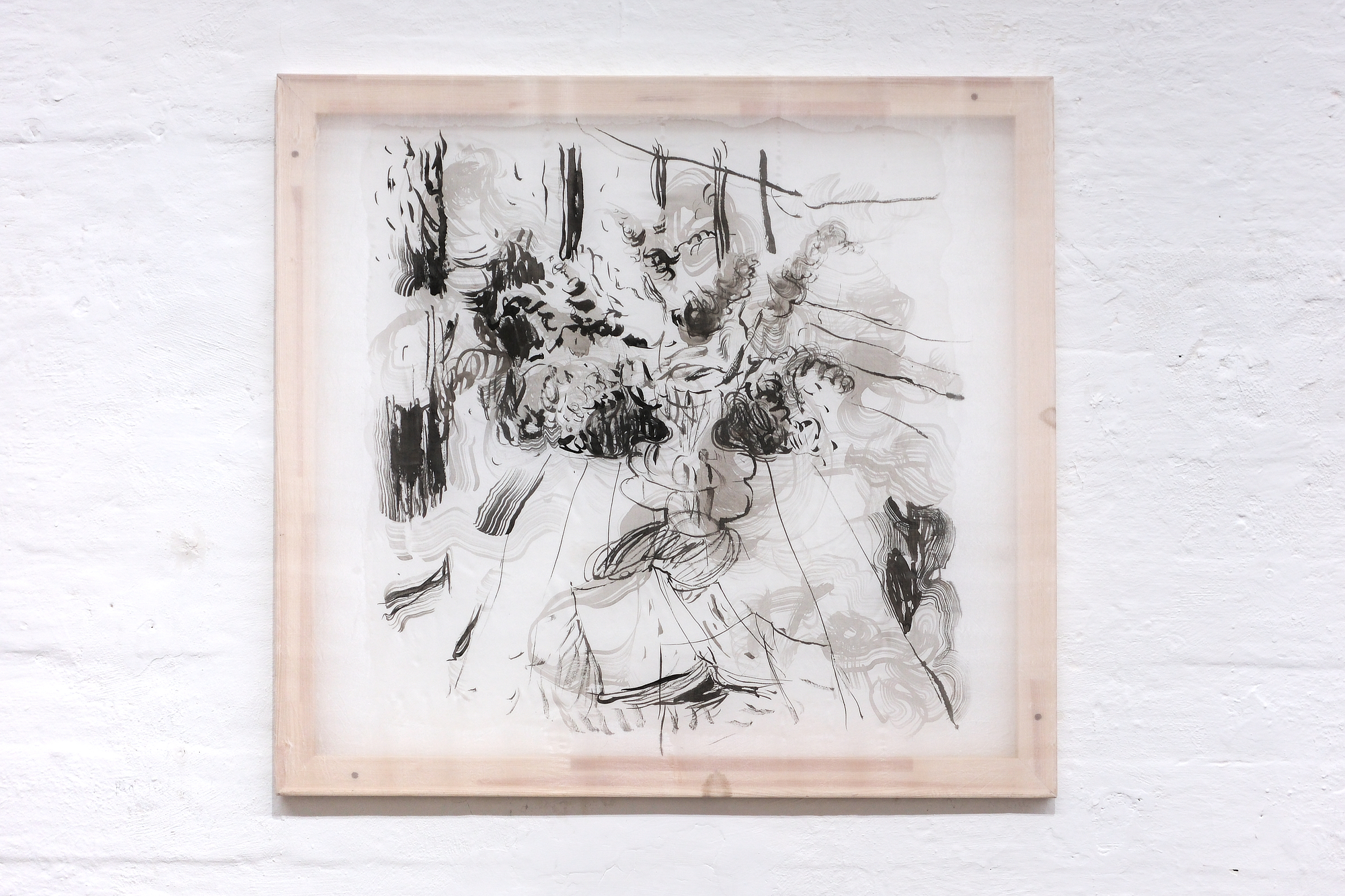The lines in Joki’s ink paintings are dense yet light. They carry a strong sense of effortless motion, giving the impression that the works have formed on their own and the lines have settled into place without strain. This impression is reinforced by the fact that Joki leaves space in her works—unpainted silk beyond the image field. Not everything has to be filled in it, and the white areas become as meaningful as the fully painted surfaces. Out of the two main colors – black and light gray – the gray appears like shadows cast by the black, creating a sense of depth and overlapping layers. In works like Palta in Kyrönlahti, Spring warble, Afternoon in Kyrönlahti, essays, and Studio view without Hammershøi, landscapes merge with objects in a still life arrangement. Meanwhile, Grandpa’s still Life, Souvenir from Lempäälä, and Clivia seem to first reveal the objects before opening them toward a landscape. The circle closes with Venice: a holiday image from a waterfront promenade, where converging and diverging lines complement each other like diagonals placed in the moment. The density of the lines fades, only to intensify again in the next moment. Joki’s rhythm of line is also the rhythm of the gaze, its movement across the silky surface.